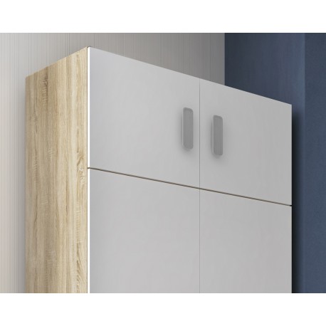 - Materiales: Piezas: Tablero de partículas melaminizado. Espesor 22/16 mm. Traseras: Tablero de fibras densidad media. Espesor 3 mm. Tacos ABS quitarruidos y antirrayaduras. Barra de colgar de aluminio. Acabados: Color Blanco y Natural.