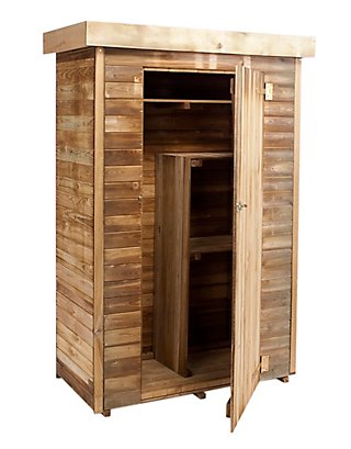 • Armario de jardín de pino idóneo para almacenar y proteger herramientas y útiles de jardín; cerrojo metálico