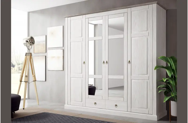 - Moderno Armario en color Blanco Brillo con 4 puertas. Perfecto como armario para la habitación o armario auxiliar. Sus líneas rectas, su color blanco y los tiradores alargados en color metálico le dan a este armario un toque moderno y juvenil. Dispone de un interior con división central, dos barras para colgar y dos estanterías, ofreciéndote gran capacidad para guardar tu ropa, complementos y accesorios. El armario está fabricado con melamina de alta resistencia con un grosor de 15 mm.