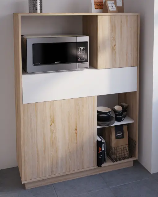 - GRAN ALMACENAJE: Compuesto por 3 módulos de armario con puertas, un compartimiento abierto, un cajón deslizable y una espaciosa encimera donde colocar tu microondas o cafetera. El armario superior tiene una balda interior ajustable en altura para adaptarse a artículos de diferentes tamaños