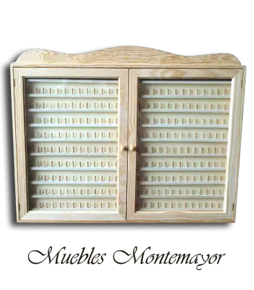 - Vitrina colecciones dedales. 2 puertas. Capacidad para 144 dedales. En madera de pino en crudo, para pintar. Medidas (ancho/fondo/alto): 60*6*54 cms. Incluye tornillería para colgar en pared.