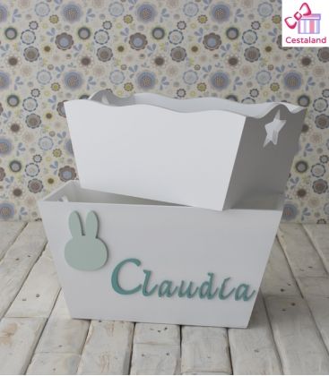 - Canastilla personalizada regalo bebé. Caja de madera blanca, tamaño mediano: 30X20x14cm. Coloca la caja en la habitación para guardar lo que necesites: toallitas, pañales, cremitas...