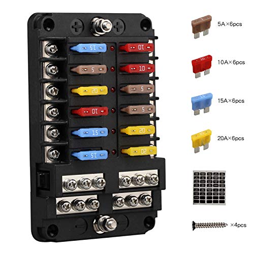 - Universal caixa fusiblera casa se puede utilizar ampliamente a se ajustan a la luz del automóvil, faro automático, lámpara ancha, luz antiniebla, luces de advertencia, refrigerador del autocaravana, cargador ventilador del automóvil y TV del automóvil, etc. El paquete de 12 ways distribuidor positivo de cuchilla incluye: 1 x soporte portafusible block de 12 seat, 4 x 20A fusible, 4 x 15A fusible, 4 x 10A fusible, 4 x 5A fusible, 2 x etiquetas de nombre del dispositivo, 4 x redondo tornillos