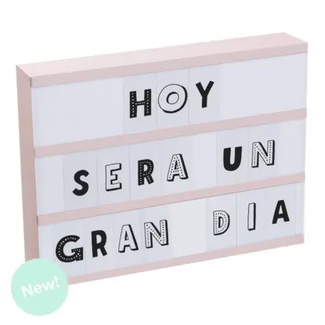 - Dimensiones 30x22x5,5 cm. Material plástico. Con esta preciosa caja de luz podrás crear el mensaje que quieras e iluminarlo. Viene junto a un set de letras y símbolos básico con los que podrás crear tus mensajes más originales. En cada una de filas podrás colocar un letras con lo que podrás hacer composiciones como "I love You", "Te Quiero", "Thank You"... Posibilidades ilimitadas!