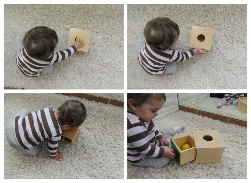 - APRENDIZAJE DE COORDINACIÓN: Mejora la coordinación ojos, mano al tener que insertar la pelota en la caja. En las escuelas de prescolar de Montessori se utiliza mucho esta caja porque es la forma de que el cerebro comience a controlar el movimiento de los dedos, la muñeca y la mano. Además a los bebés les parece curioso encontrar de nuevo la pelota en el cajón y se convierte en un juego muy divertido.