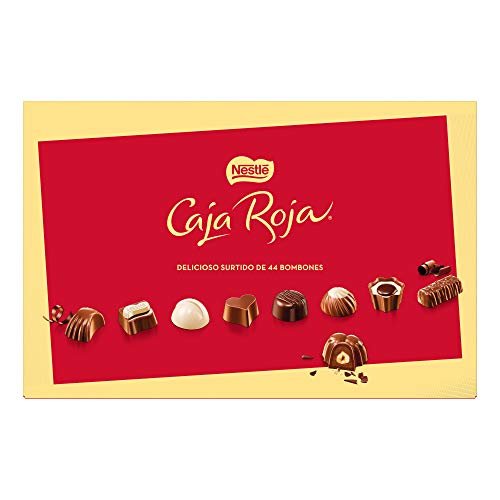 - CAJA ROJA ofrece una deliciosa combinación de cremosos y fundentes bombones de chocolate blanco, chocolate negro y chocolate con leche con diferentes e irresistibles adiciones (avellanas, almendras, caramelo, naranja..).