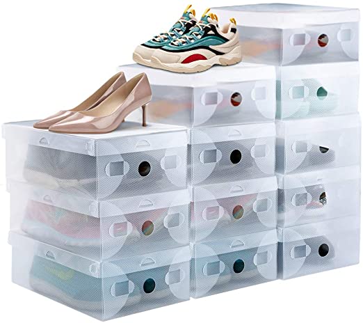 - Qué hay en la caja: Paquete de 18 cajas de zapatos transparentes con puertas delanteras, diseño plegable y apilable, orificios de ventilación. Despídete de los zapatos dispersos por todas partes y pon tus zapatos en orden ahora