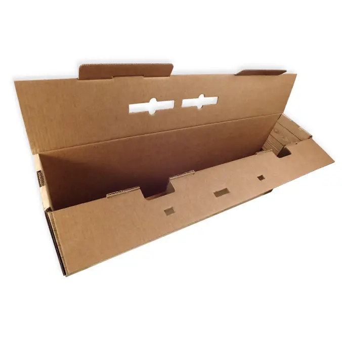- Caja fabricado en cartón ondulado de color blanco mate exterior y de color marrón kraft interior.