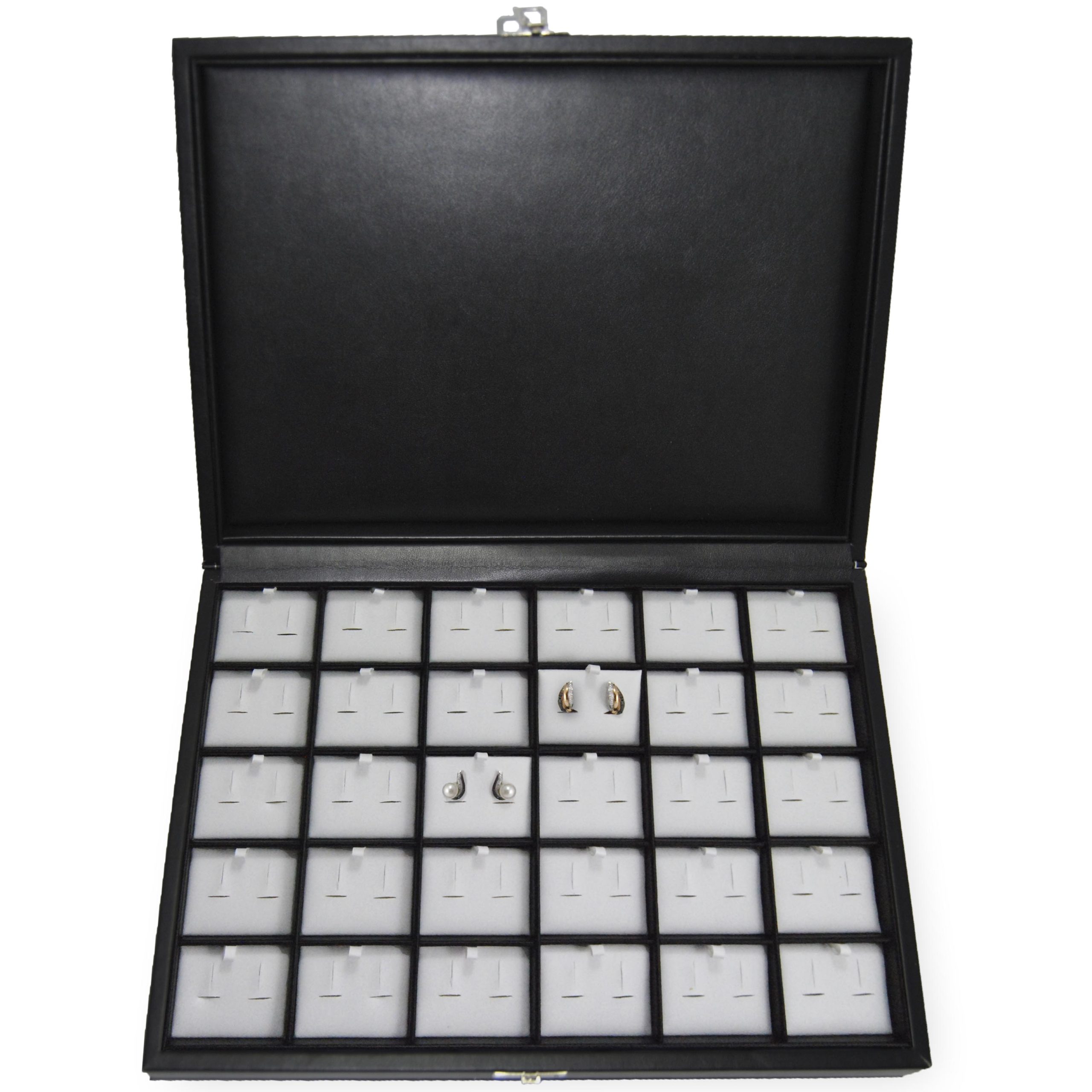 - BANDEJAS PARA JOYAS : Este joyero gris mide 35,4 x 24,4 cm y 4,8 cm de grosor. Tiene 40 ranuras que con una separación de 1 cm. En la parte superior de la caja para pendientes hay una tapa de cristal transparente. En la parte frontal hay 2 cierres plateados, esto mantiene sus joyas seguras cuando están cerrados. Las ranuras mantienen sus pendientes seguros así no se mueven.