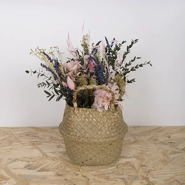 - DESCRIPCIÓN DEL PRODUCTO: Cesto artesano de mimbre con flores preservadas seleccionadas por nuestros maestros floristas. Composición de variedad de eucalipto preservado con lavanda preservada.