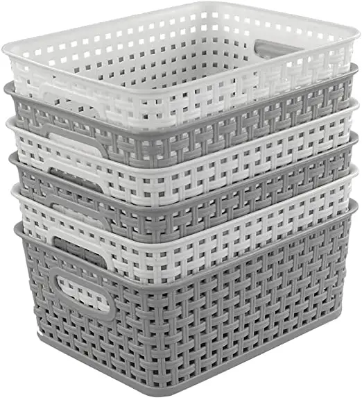 - RESISTENTE Y DURADERO Hechos de plástico polipropileno, material duradero y resistente. Los contenedores de almacenamiento tienen una estética de tejida mimbre sin tapa para almacenamiento y organización transpirable y abierto. Estilo bandeja para uso en grandes cajones, armarios, estantes o mostradores.