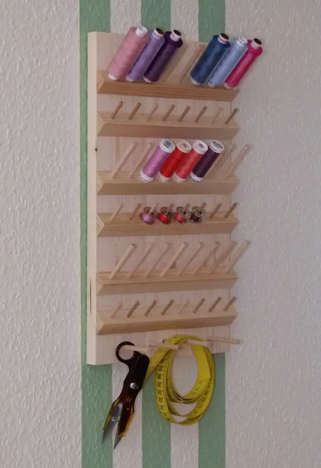 - Soporte para 32 bobinas de hilo de coser. El tamaño del soporte para hilo de coser es de 40 x 31 cm. El soporte para hilo de coser HAITRAL con 32 bobinas y la distancia entre las bobinas es de 5 cm. Las piquetas miden 6 cm. Puede funcionar bien para organizar bobinas de hilo pequeñas y medianas y grandes y espigas.