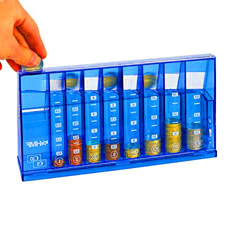 - Clasificador de monedas de EURO, con columnas graduadas (impresas) con el total para cada una de las monedas.