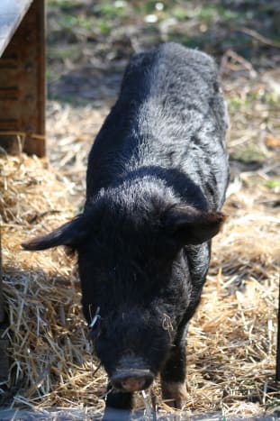 No estaba familiarizado con las cercas eléctricas, pero rápidamente aprendió a respetarlas y evitarlas. Nunca se había esperado que bebiera de un chupón de agua, pero rápidamente dominó esa habilidad. Nunca había sido jardinero, y sospecho que muchas de las verduras que descubrió en nuestro suelo eran nuevas para él, pero se ha adaptado muy bien, y nuestro primer cerdo en miniatura es ahora un miembro activo de nuestra familia y equipo agrícola.