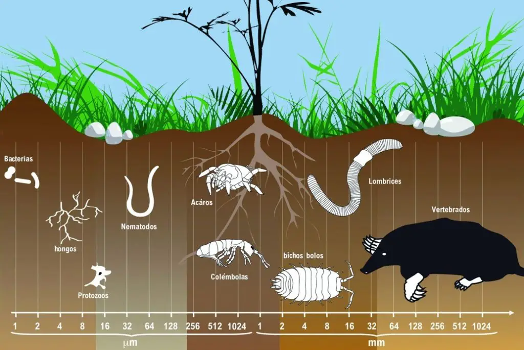 Las lombrices de tierra reducen los residuos más grandes, luego los miriápodos, colémbolos y nematodos se harán cargo. El paso de la materia orgánica a través del tracto digestivo de estos animales permite la formación de agregados estables para dar cabida a las bacterias y los hongos del suelo, que pueden incluso entrar en simbiosis en algunos casos.