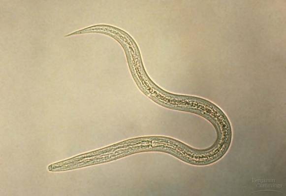 Los nematodos son gusanos microscópicos de menos de 1mm de largo, por lo que son virtualmente invisibles a simple vista. Todos los nematodos pertenecen a la orden Ecdysozoans. Estos pequeños gusanos tienen una boca y un ano y, por lo tanto, un sistema digestivo completo pero sin material respiratorio o vascular. Su cuerpo está cubierto con una cutícula impermeable que les permite respirar de forma pasiva. Su hidroesqueleto bajo la presión constante de la cutícula les da una forma circular característica.
