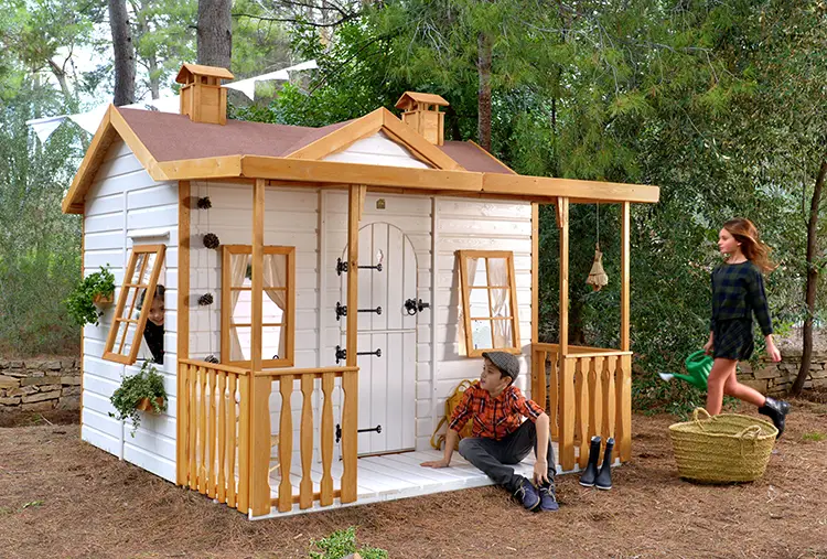 - Espaciosa: esta cabaña de madera para niños es especialmente espaciosa, con su previa equipada con un pequeño banco. Para divertirse durante horas