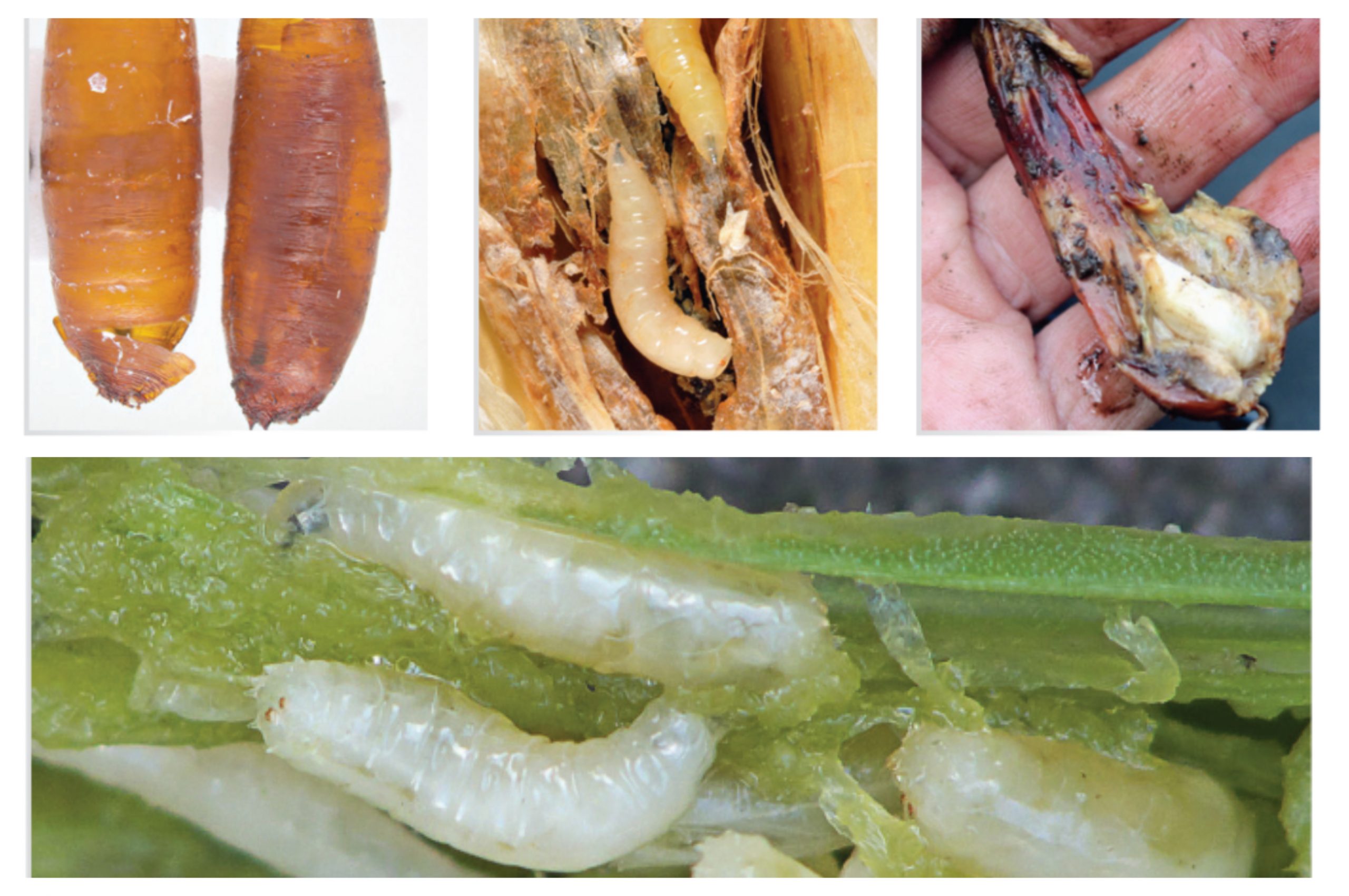 Daños Responsable Numerosas especies de orugas de lepidópteros, himenópteros o gusanos de dípteros cavando galerías en el follaje: Gimnostoma de Napomyza (minero del puerro); Lyriomyza brassicae (minador de la hoja de la col), Chromatomyia syngenesiae (minador de la hoja del crisantemo), Phillocnistis citrella (minador de la hoja de los cítricos, la vid y el jazmín) …