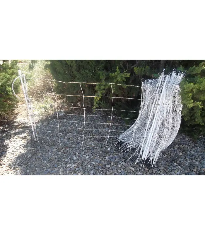 - Contiene 14 postes con punta doble de acero para montar y desmontar rápidamente dando más estabilidad a la red. Incluye conectores al inicio y final de la malla para empalmar varias redes juntas y para cerrar el circuito con el pastor eléctrico