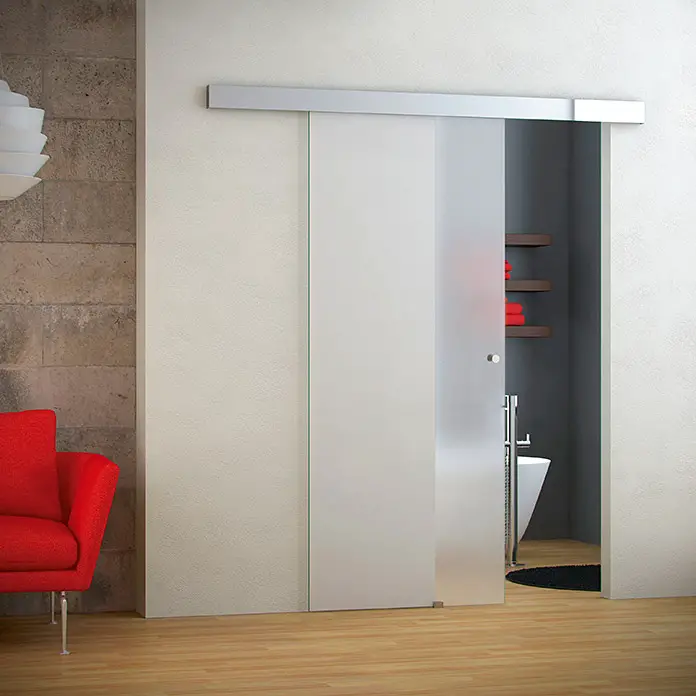 - Fácil montaje con cierre suave (autocierre de la puerta corredera). La puerta corredera de cristal con ruedas es fácil de montar. Gracias al sistema colgante se puede montar la puerta flotante tanto a la izquierda como a la derecha.