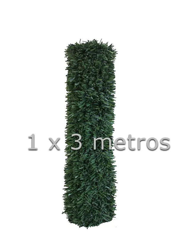 - Seto artificial de ocultación de 3x1 metros, no inflamable y con tratamiento estabilizador anti-UV que le otorga propiedades que alargan su vida útil, evitando su deterioro y decoloración por el paso del tiempo.