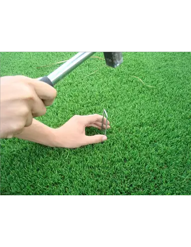 - Se camuflan en el césped una vez insertadas: estas grapas de acero galvanizado están semirecubiertas en pintura verde para el propósito de camuflarse sin problemas en el césped una vez martillado con éxito en el suelo.