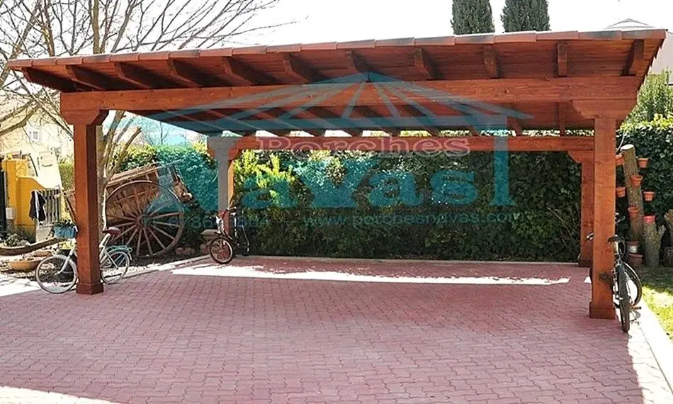 - Su estructura permite variar el uso principal de esta cochera de madera, úselo como cobertizo, cenador de jardín o zona de relax en su piscina. Al ser un producto de madera natural, puede presentar manchas azules en alguna zona al estar tratadas. Al no tener una cubierta, podrá elegir la cubierta que más le convenga: policarbonato, hierro corrugado, tejas o incluso PVC.