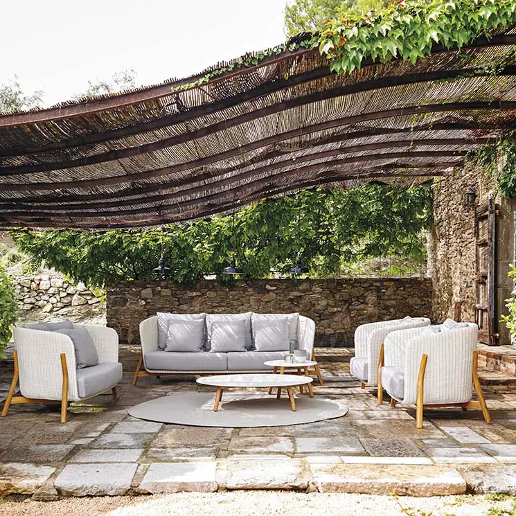 Para crear una zona de sombra efectiva y siempre agradable, es necesario pensar no sólo en el techo, sino también en los lados de la zona ; cortinas o textiles reales colocados de forma artesanal nos ayudarán a conseguir este objetivo.