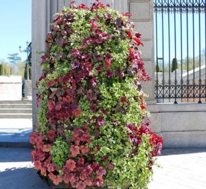En este caso, se han reciclado bloques de hormigón perforado para crear un lecho elevado redondo, dentro del cual se ha creado una espiral de flores que crecen en un suelo inclinado; el efecto decorativo es muy llamativo