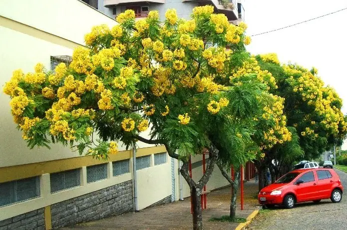 La abundante floración amarilla que se da durante el verano, de noviembre a enero, hace que este árbol sea muy atractivo. Los frutos tienen forma de vaina de leguminosas y se producen en invierno.