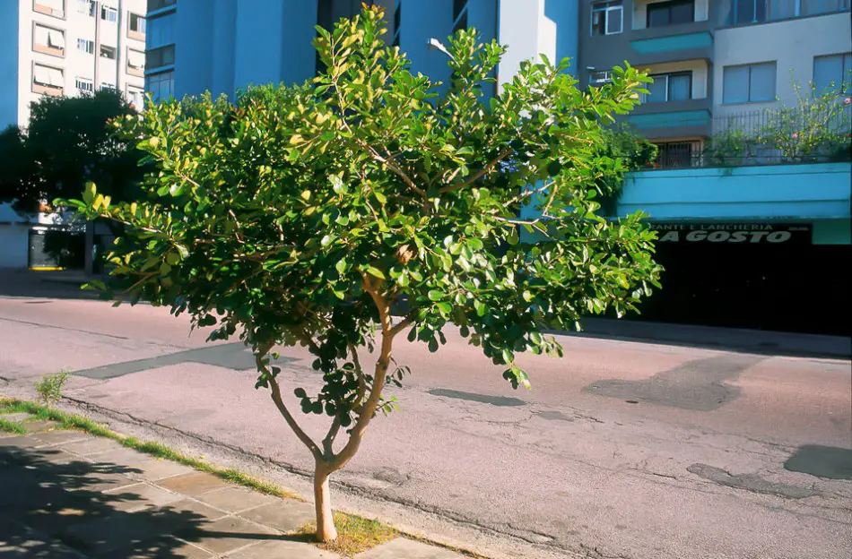 Fruto de pequeño tamaño, de 3 a 6 m de altura, pero muy resistente y frondoso. Tiene hojas simples, lisas, sin nervaduras y una floración duradera, que puede durar de junio a diciembre.