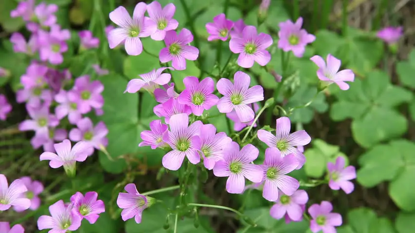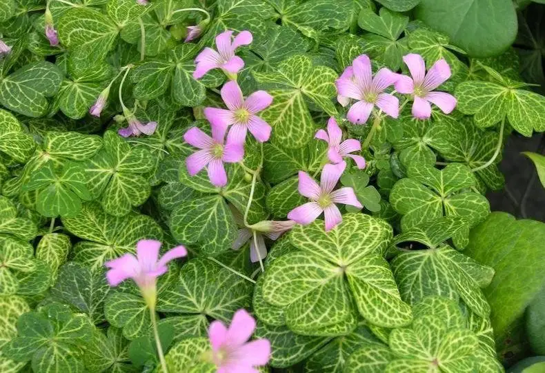 Conocido como falso trébol, porque el verdadero trébol tiene 4 hojas. Es una planta perenne que puede alcanzar los 15 cm de altura, sus flores son pequeñas y rosadas,