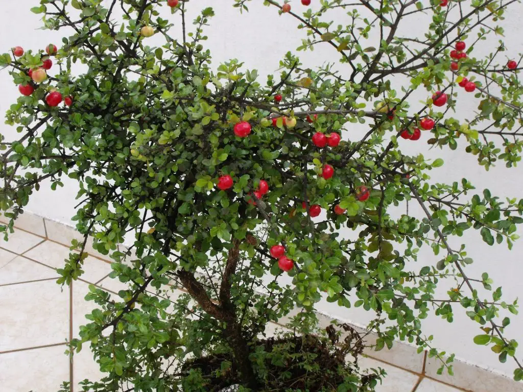 En el mercado incluso puedes encontrar versiones de acerola en bonsái. En las versiones de bonsai, la baya rojiza es proporcional al tamaño del árbol.