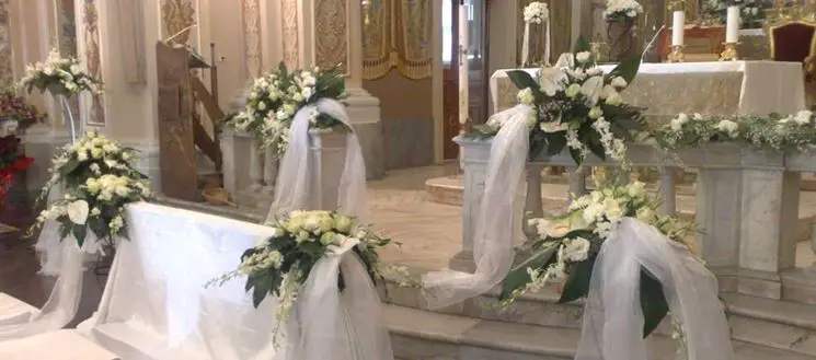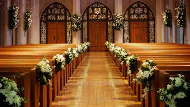 Dentro de las iglesias, las decoraciones no están colocadas como sucede, sino que siguen patrones precisos diseñados para hacer que el lugar sea romántico. El altar mayor es generalmente la parte más decorada de todas porque permanecerá en el centro de la escena durante la ceremonia. Aparecerá en una gran cantidad de tomas y servirá como telón de fondo escénico para el rodaje. Los espacios adyacentes al altar también tienen su importancia y estarán decorados de forma menor. La balaustrada que separa físicamente la nave del altar estará repleta de adornos florales y cintas de raso en blanco o en los más diversos tonos pastel. Casi todo el mundo elige ahora decorar el lateral de los bancos para crear una especie de pasillo de entrada para los novios. Lo importante es la moderación porque hasta los excesos son vulgares.