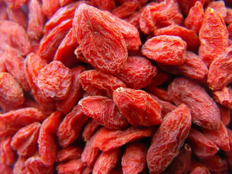 Las bayas de Goji contienen proteínas, carbohidratos, calcio, azúcares, fósforo, un alto porcentaje de fibra, omega tres y omega seis, así como varios tipos de vitaminas, incluida la C, presentes en un porcentaje aún mayor que la naranja. Teniendo en cuenta la presencia de estos principios nutricionales, las bayas de Goji pueden aportar numerosos beneficios al organismo. Promueven la circulación sanguínea, regulan el metabolismo, mejoran los tejidos musculares, fortalecen el sistema inmunológico, ayudan a mantener el cabello y la piel jóvenes. Las bayas de Goji también son conocidas por su poder antioxidante y se utilizan para la prevención y el tratamiento de enfermedades oncológicas. Gracias al buen contenido de carotenoides, son excelentes para mantener la salud ocular.