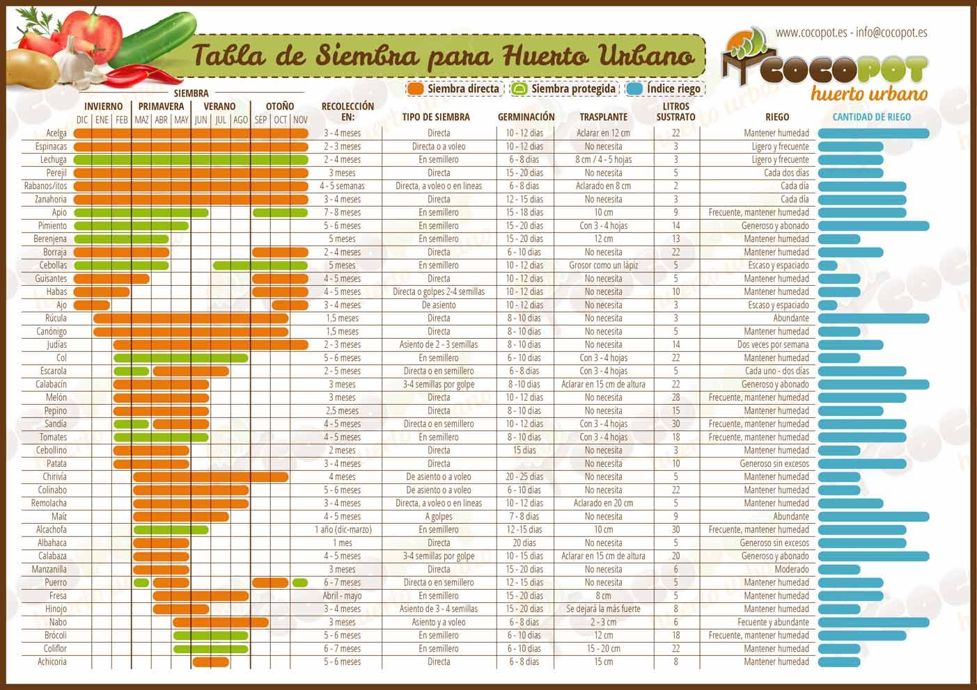 Este cuadro da una indicación de los períodos de siembra, transplante y cosecha de las principales hortalizas y de un clima medio (tipo Ile-de-France). Para cada especie, existe una amplia variedad de variedades adaptadas a diferentes períodos de crecimiento.