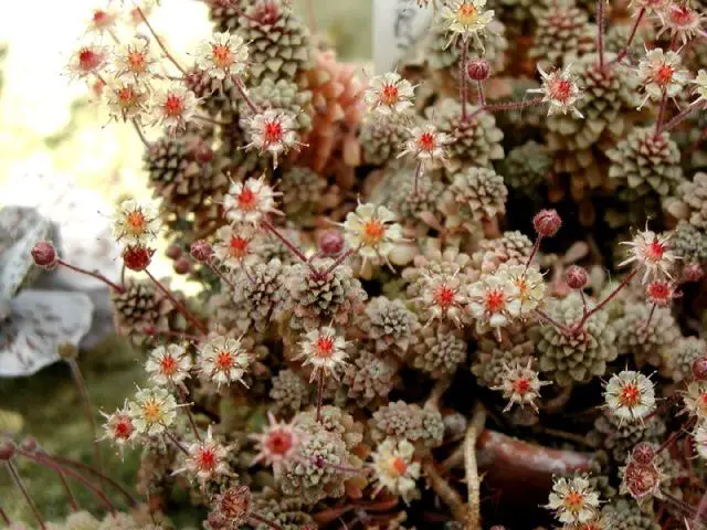 Es una suculenta copetuda de hasta 12 cm de altura, con pequeñas rosetas de muchas hojas, formando racimos masivos, brillantes y densos que en junio tienen numerosas flores pequeñas de color violeta a modo de sombrillas.