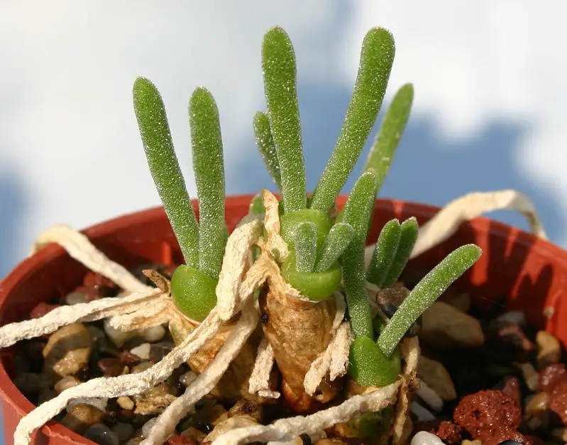 Las diminutas perlas brillantes de la epidermis son celdas especiales de almacenamiento de agua ricas en azúcares característicos de las suculentas. En Monilaria, estas celdas pueden tener 0,5 mm de diámetro y retienen su humedad durante semanas cuando se separan y se exponen al aire seco.