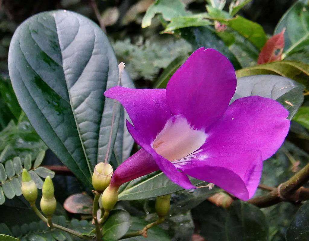 Saritéia, como se le conoce popularmente, es una enredadera semileñosa perteneciente a la familia Bignoniaceae con hasta 10 m de altura, ramas cilíndricas y polinizada por una abeja verde azulada, la Euglossa bazinga, que penetra en la flor, con forma de un embudo, para alimentar. Su origen es de Colombia, Ecuador, Panamá y Venezuela.