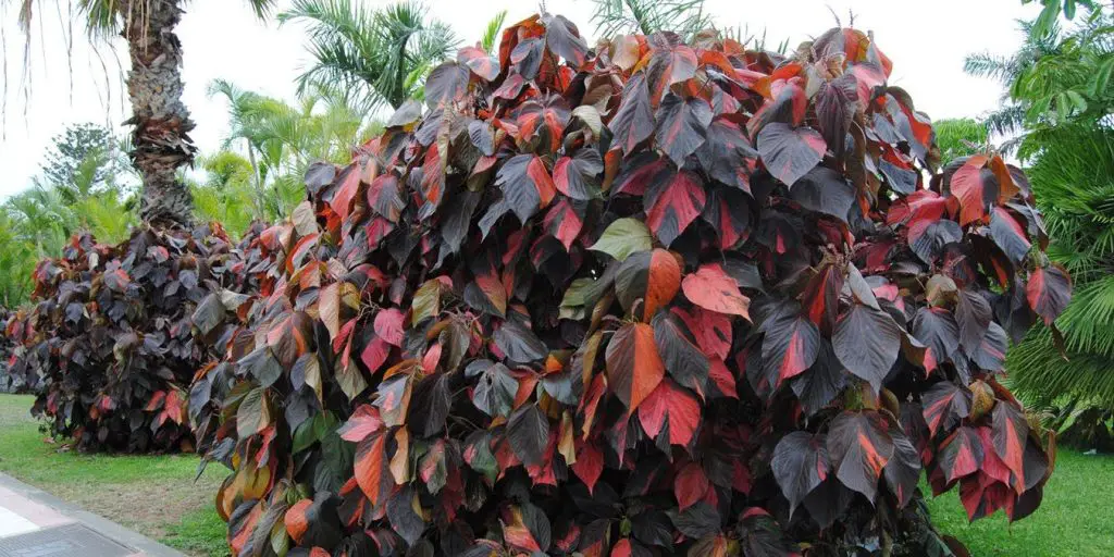 Tiene un aspecto redondeado y un follaje vistoso. Hojas anchas, brillantes, con bordes dentados, plisadas, teñidas en tonos rojos.