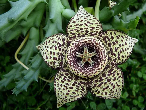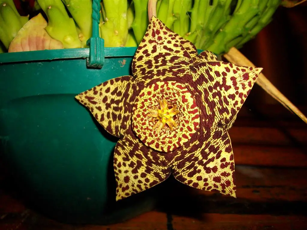 Las flores en forma de estrella son el gran atractivo de la especie, aparecen de verano a otoño y pueden alcanzar hasta 7 cm de diámetro, de color amarillento y salpicadas de manchas de color marrón rojizo.