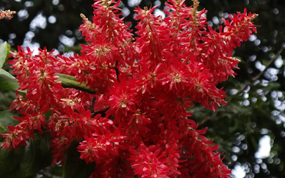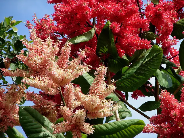 Su floración atrae a las abejas, con las plantas femeninas liberando inflorescencias erguidas, de color salmón y espectaculares, mientras que las masculinas tienen inflorescencias grisáceas, largas y colgantes.