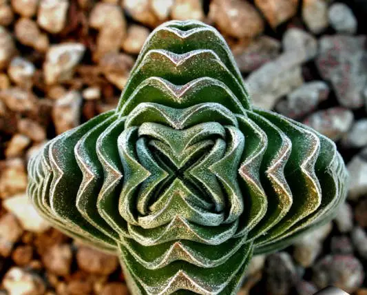 Sus hojas son de color gris plateado a verde grisáceo, similares a escamas, muy gruesas y anchas en forma de corazón que aparece en las puntas.