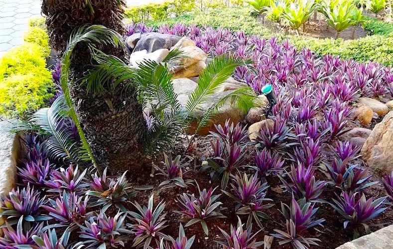 Pequeñas flores blancas de tres pétalos que quedan ocultas por brácteas violetas. Aparecen casi todo el año y no son atractivos.