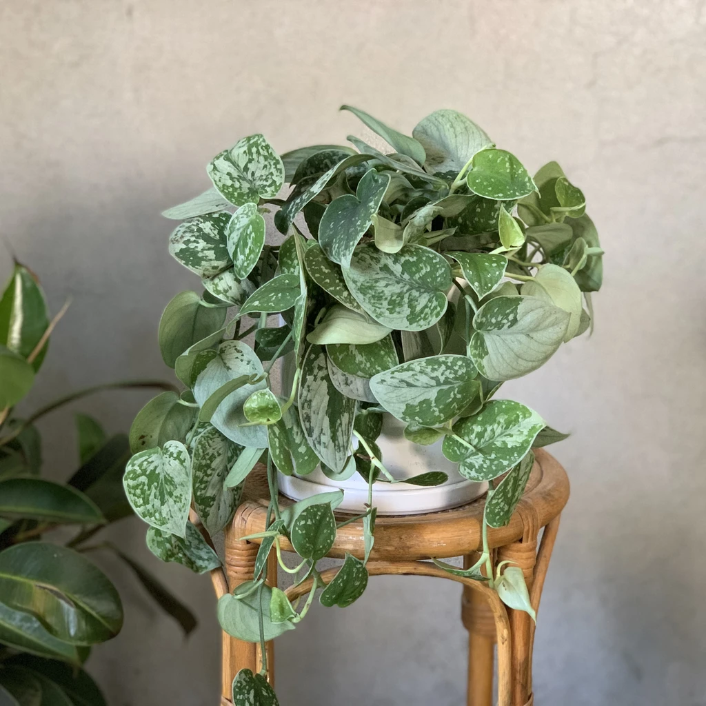Cubre la superficie con pajitas para mantener la tierra húmeda, tal como le gusta a esta especie, y no olvides fertilizarla una vez al mes, evitando usar demasiado calcio, ya que los potos satinados prefieren suelos ligeramente ácidos (y el calcio termina tirando un poco más pro alcalino).