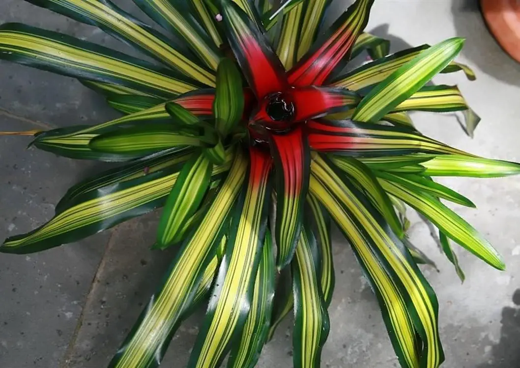 Son de color verde oscuro en forma típica. Hay varias variedades de hojas con vetas cremosas de color blanco, verde y rosa. Durante el período de floración, las hojas adquieren un tono rojizo cerca de la copa central. El color notable sigue siendo atractivo durante varios meses.