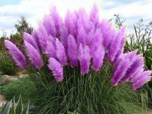 Sus inflorescencias parecen plumas grandes y pueden ser de color blanco, amarillo, rosa, morado, azul cielo y morado, y se forman en verano y otoño.