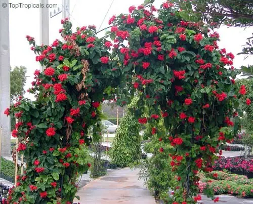 El Clerodendron Rojo, una cepa tipo vid, pertenece a la familia Lamiaceae, originaria de África tropical, perenne, semi leñosa, con ramas largas, crecimiento lento a moderado, vigorosa, de hasta 4 metros de altura y muy ornamental.