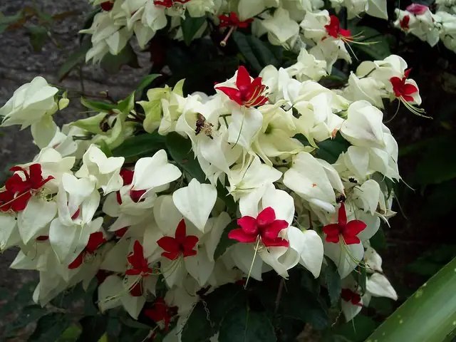 Las inflorescencias se encuentran en grupos terminales, con flores pequeñas y ligeramente planas con cálices blancos inflados, de los cuales emergen corolas rojo oscuro con estambres prominentes, que se extienden mucho más allá de los pétalos.
