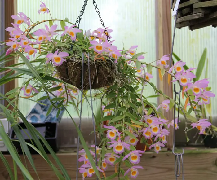 El conjunto colgante de pseudobulbos en flor forma verdaderas cascadas de flores, que se superponen a las plantas viejas, en un hermoso conjunto.
